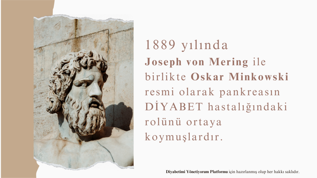 Orta çağ İslam dünyasında İbn-i Sina (980-1037), hekimlik yaptığı odönemlerde diyabetin klinik özelliklerini detaylandırır. 1788’de Thomas Cawley diyabetli bir hastanın otopsi sonucu sonrası elde ettiği sonuçlara dayanarak, pankreas beziyle diyabet arasında ilişki olduğuna dikkat çekmiş isimlerdendir. 1889 yılında ise Joseph von Mering ile birlikte Oskar Minkowski resmi olarak pankreasın diyabet hastalığındaki rolünü ortaya koymuş isimlerdir.