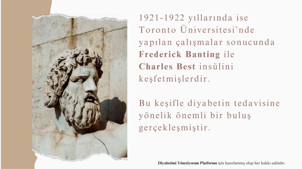 1921-1922 yıllarında Toronto Üniversitesi’nde yapılan çalışmalar neticesinde insülini Frederick Banting ile Charles Best keşfetmiş. Bu keşifle diyabetin tedavisine yönelik önemli bir buluş gerçekleşmiş, ardından insülinin diyabet tedavisinde kullanımına geçilmiştir. Görülmektedir ki diyabet, dünya geneli önemli bir sağlık krizi olarak karşımızda durmakta. Bizler diyabet gerçeğini tanıyarak bu sorunun farkında olmaz ve gereken önlemleri almazsak, dünya geneli diyabet sorununun hızla artarak büyümeye devam edeceği öngörülmekte.